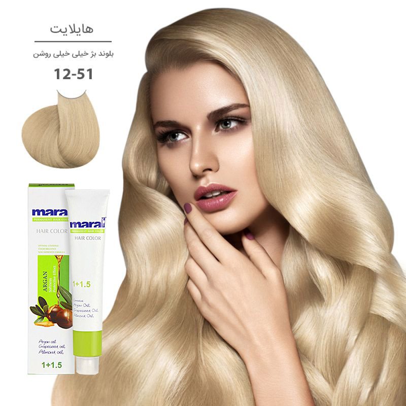 رنگ موی مارال 51-12 بلوند بژ خیلی خیلی روشن حجم 100 میل رنگ موی اصل و با سابقه محصول کشور ایران است و از بهترین رنگ موهای ایرانی در بازار رنگ موهای ایرانی به شمار میآید. این رنگ مو جزو رنگ موهای دائمی بوده و مدت زمان طولانی با توجه به مراقبت صحیح، بر روی موها باقی میماند. این رنگ مو دارای حداقل آمونیاک است و به هیچ عنوان باعث شکنندگی، آسیب و خشکی مو نمیشود. مارال سری هایلایت یک نوع رنگ مو است که در آن رنگهای مختلف به صورت هایلایتهایی روی موها اعمال میشود. این هایلایتها معمولاً در رنگهای مختلفی مانند طلایی، نقرهای، بلوند و… قرار میگیرند.